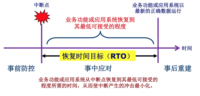 RTO(Recovery Time Objective)分业务RTO和系统RTO,指的是业务或系统从中断到恢复所需要的必须时间,是业务或系统恢复及时性的指标。具体来说就是允许用多长时间恢复中断的业务或重要系统。