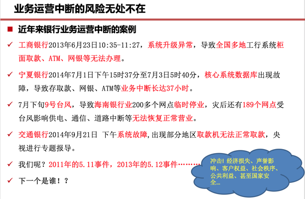 《商业银行业务连续性监管指引》(银监发[2011] 104号)第二条:业务连续性管理是指商业银行为有效应对重要业务运营中断事件,建设应急响应、恢复机制和管理能力框架,保障重要业务持续运营的一整套管理过程,包括策略、组织架构、方法、标准和程序。